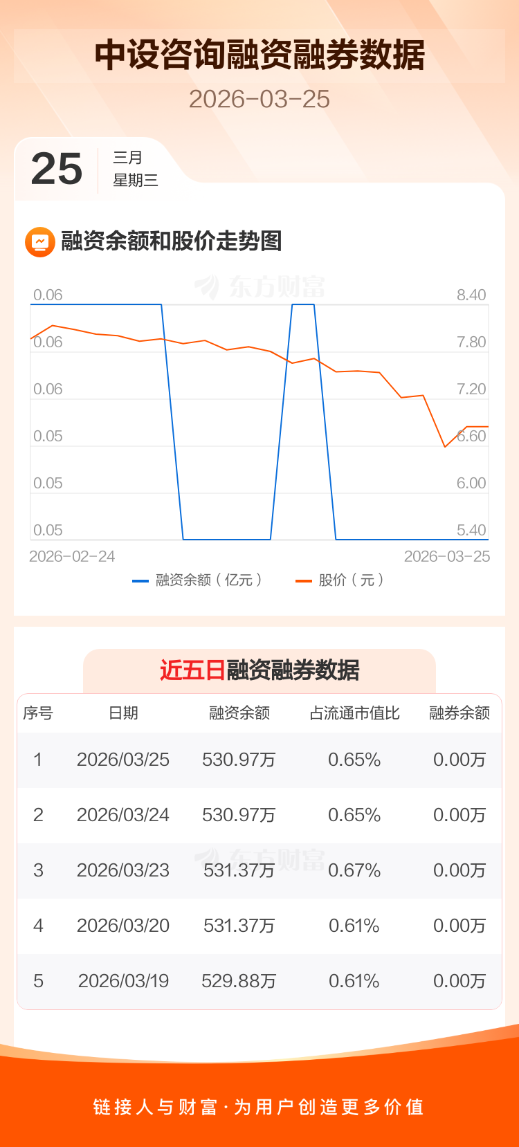 交易所最新数据显示,中设咨询于2026年3月25日获融资买入0元,融资偿还0元,当日融资净买入0元。目前,该股融资余额530.97万,占流通市值比例为0.65%。