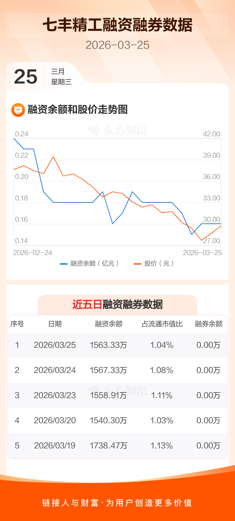 交易所最新数据显示,七丰精工于2026年3月25日获融资买入174.44万元,融资偿还178.44万元,当日融资净偿还4万元。目前,该股融资余额1563.33万,占流通市值比例为1.04%。