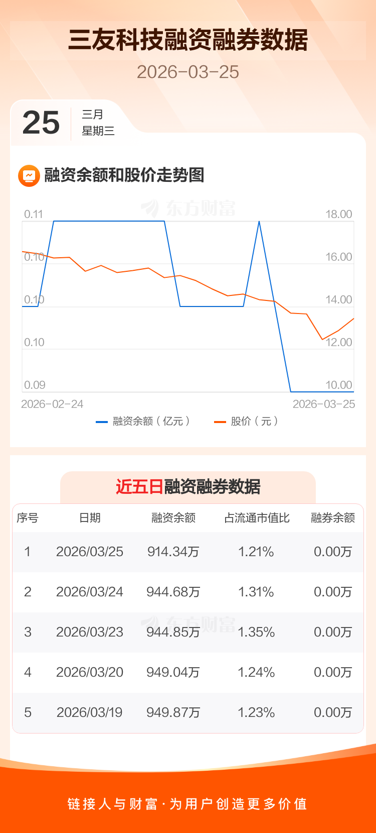 交易所最新数据显示,三友科技于2026年3月25日获融资买入5.72万元,融资偿还36.06万元,当日融资净偿还30.34万元。目前,该股融资余额914.34万,占流通市值比例为1.21%。
