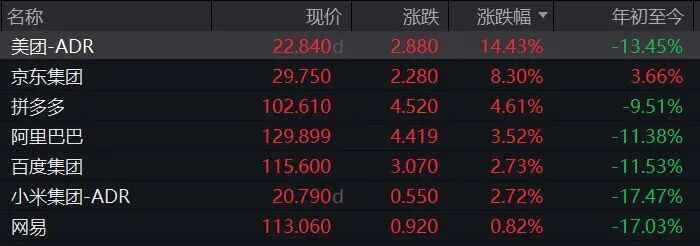 在外卖巨头和拼多多财报拉动,热门中概股普涨表现强势。中概股科技龙头指数涨1.93%,纳斯达克中国金龙指数涨1.86%。个股方面,美团大涨14.43%,京东涨超8%,拼多多、爱奇艺涨超4%,阿里巴巴涨超3%,百度、小米涨超2%,理想汽车、哔哩哔哩涨超1%。