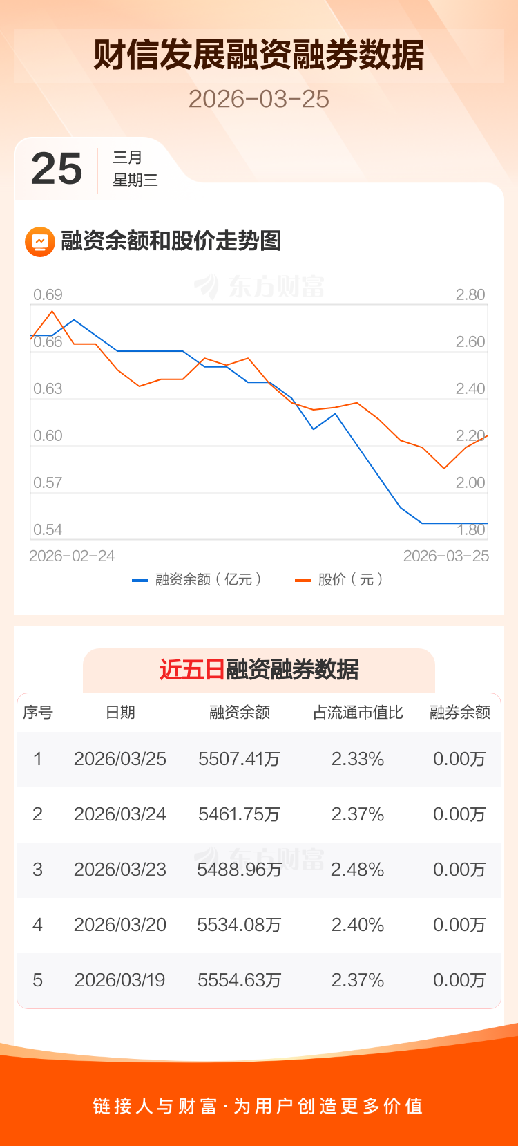 交易所最新数据显示,财信发展于2026年3月25日获融资买入78.32万元,融资偿还32.66万元,当日融资净买入45.66万元。目前,该股融资余额5507.41万,占流通市值比例为2.33%。