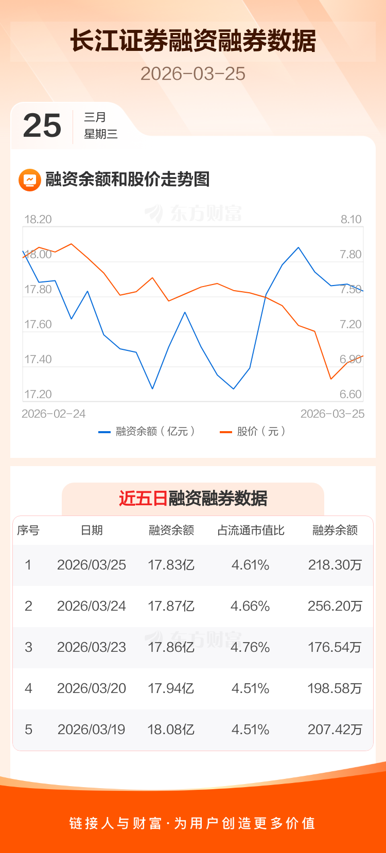 交易所最新数据显示,长江证券于2026年3月25日获融资买入3905.33万元,融资偿还4356.33万元,当日融资净偿还451万元。目前,该股融资余额17.83亿,占流通市值比例为4.61%。