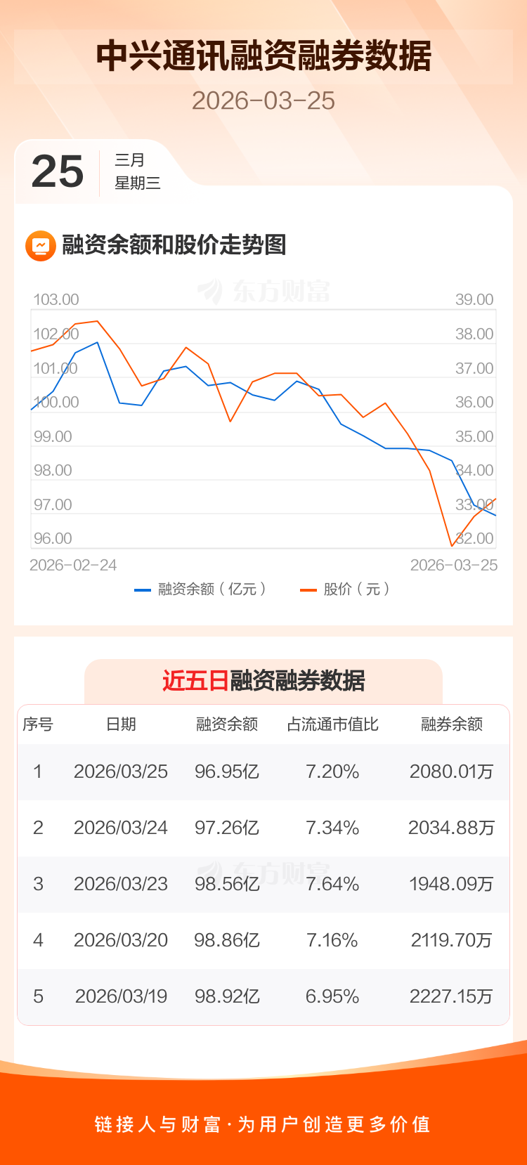 交易所最新数据显示,中兴通讯于2026年3月25日获融资买入2.25亿元,融资偿还2.57亿元,当日融资净偿还3119.75万元。目前,该股融资余额96.95亿,占流通市值比例为7.20%。