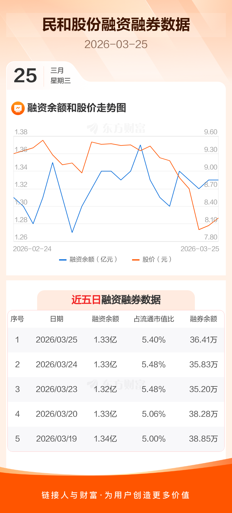 交易所最新数据显示,民和股份于2026年3月25日获融资买入545.32万元,融资偿还525.14万元,当日融资净买入20.18万元。目前,该股融资余额1.33亿,占流通市值比例为5.40%。