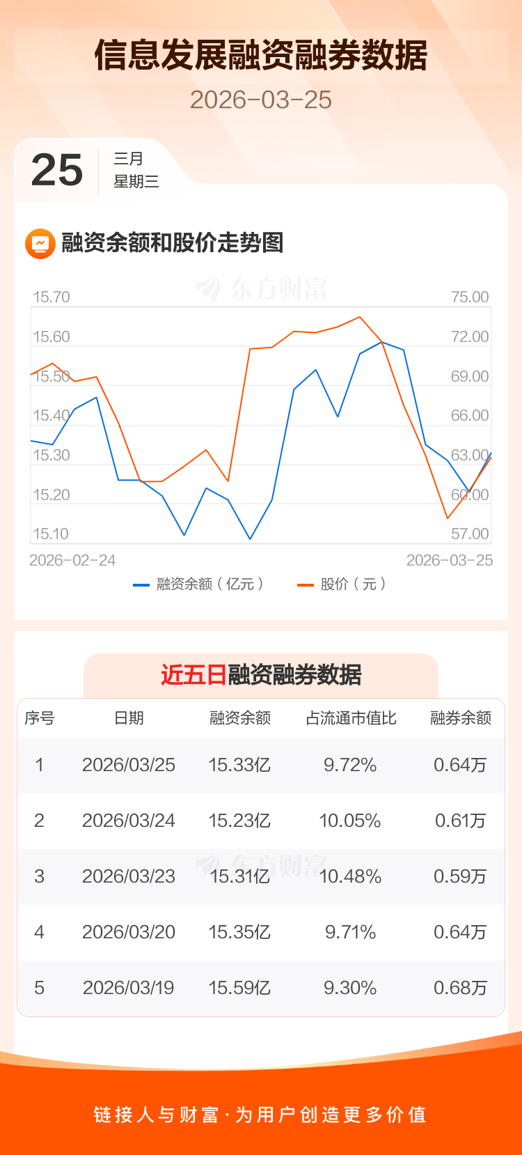 交易所最新数据显示,信息发展于2026年3月25日获融资买入4254.92万元,融资偿还3191.53万元,当日融资净买入1063.39万元。目前,该股融资余额15.33亿,占流通市值比例为9.72%。