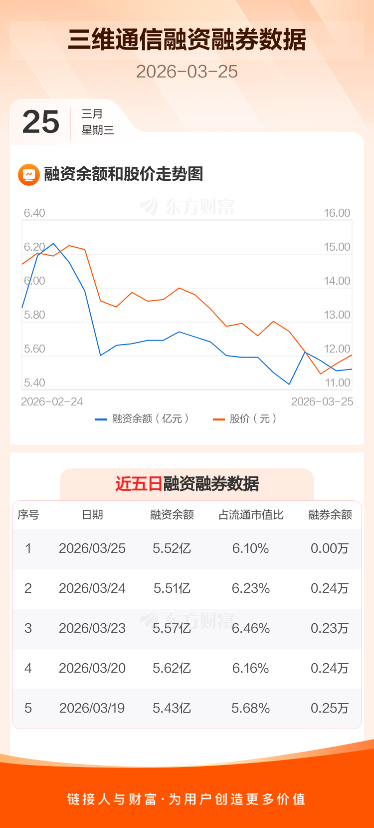 交易所最新数据显示,三维通信于2026年3月25日获融资买入3969.03万元,融资偿还3857.75万元,当日融资净买入111.27万元。目前,该股融资余额5.52亿,占流通市值比例为6.10%。