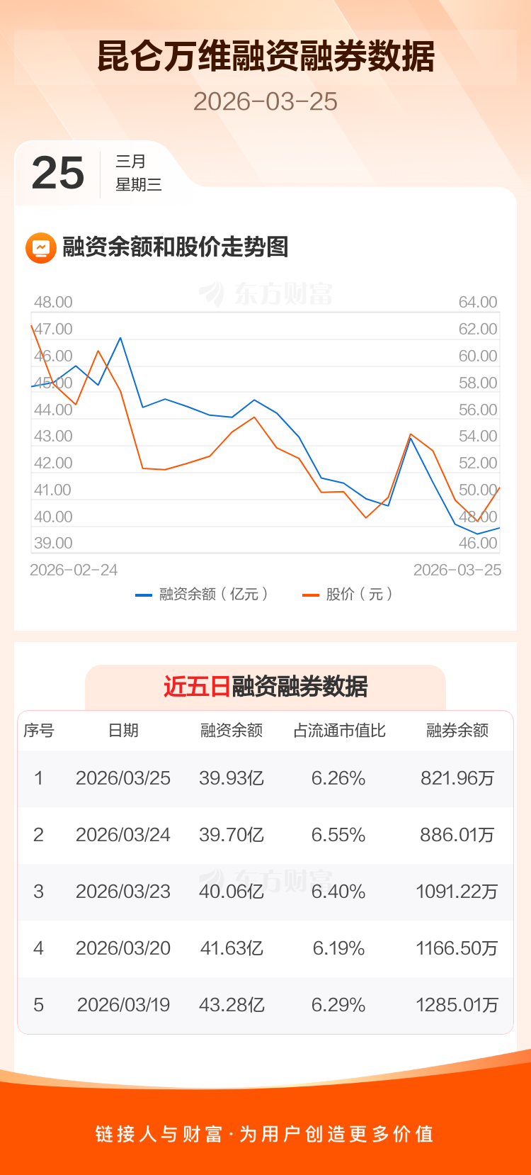 交易所最新数据显示,昆仑万维于2026年3月25日获融资买入3.59亿元,融资偿还3.35亿元,当日融资净买入2318.53万元。目前,该股融资余额39.93亿,占流通市值比例为6.26%。