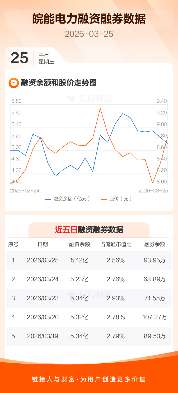 交易所最新数据显示,皖能电力于2026年3月25日获融资买入8633.27万元,融资偿还9744.51万元,当日融资净偿还1111.24万元。目前,该股融资余额5.12亿,占流通市值比例为2.56%。