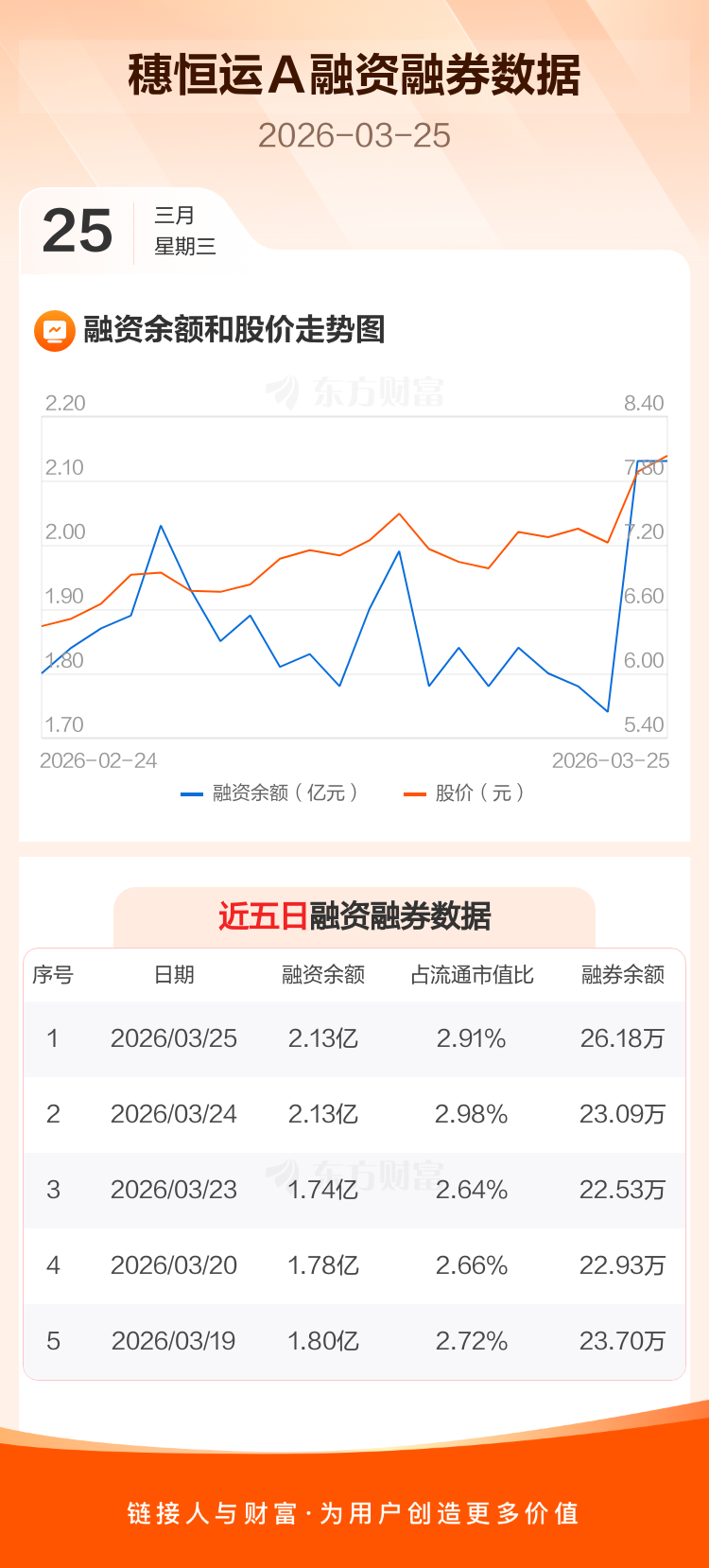 交易所最新数据显示,穗恒运A于2026年3月25日获融资买入1.04亿元,融资偿还1.05亿元,当日融资净偿还95.15万元。目前,该股融资余额2.13亿,占流通市值比例为2.91%。