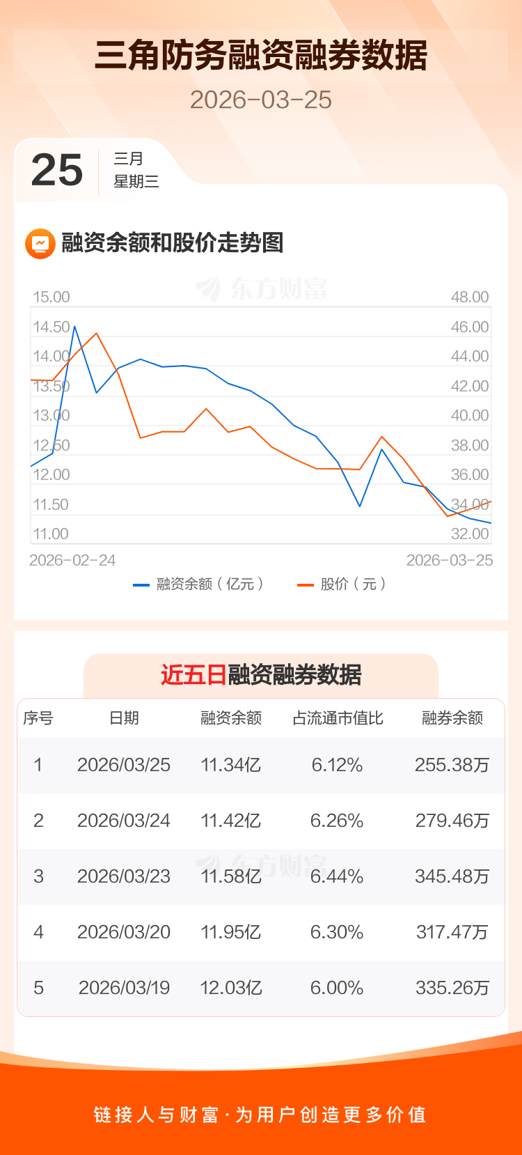 交易所最新数据显示,三角防务于2026年3月25日获融资买入6554.05万元,融资偿还7289.25万元,当日融资净偿还735.2万元。目前,该股融资余额11.34亿,占流通市值比例为6.12%。