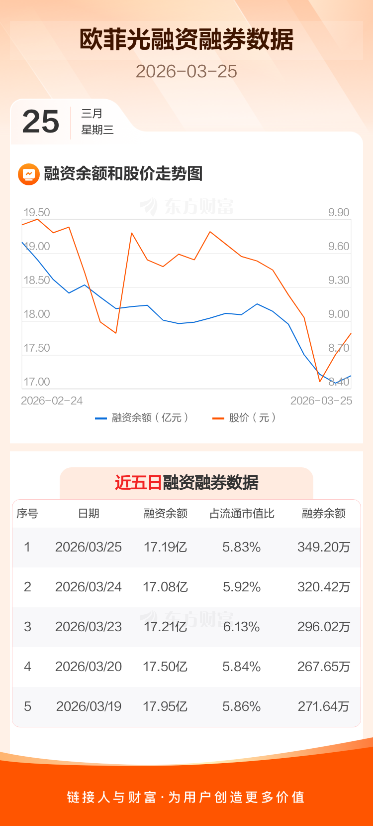 交易所最新数据显示,欧菲光于2026年3月25日获融资买入3932.38万元,融资偿还2816.81万元,当日融资净买入1115.58万元。目前,该股融资余额17.19亿,占流通市值比例为5.83%。