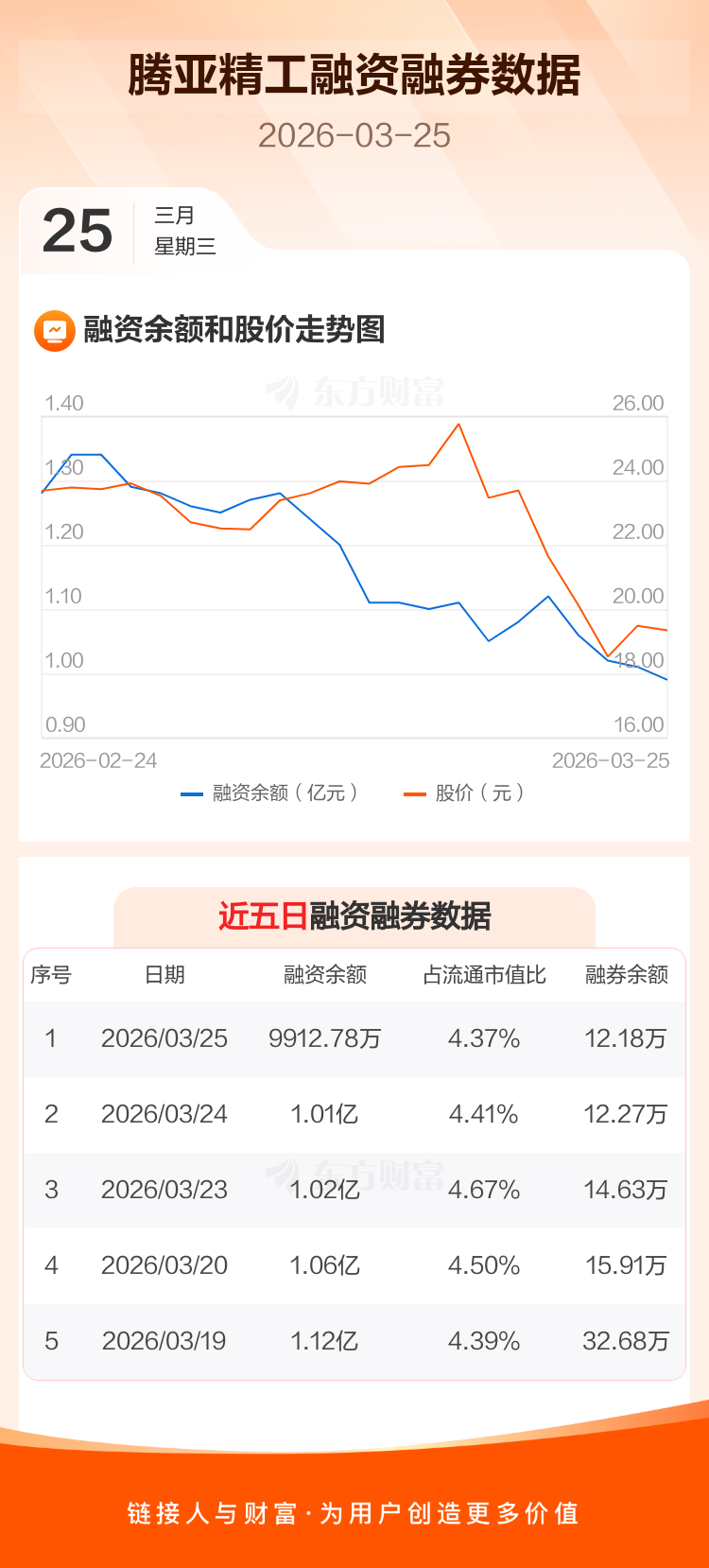 交易所最新数据显示,腾亚精工于2026年3月25日获融资买入689.91万元,融资偿还868.23万元,当日融资净偿还178.32万元。目前,该股融资余额9912.78万,占流通市值比例为4.37%。