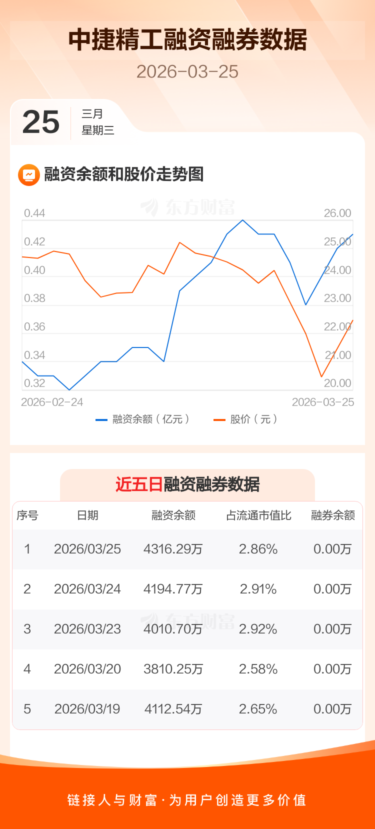 交易所最新数据显示,中捷精工于2026年3月25日获融资买入506.77万元,融资偿还385.24万元,当日融资净买入121.52万元。目前,该股融资余额4316.29万,占流通市值比例为2.86%。