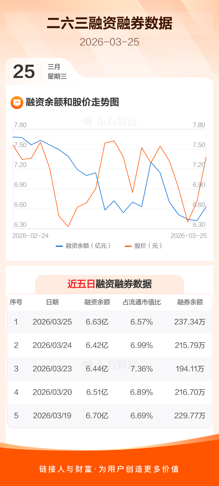 交易所最新数据显示,二六三于2026年3月25日获融资买入1.03亿元,融资偿还8222.03万元,当日融资净买入2125.47万元。目前,该股融资余额6.63亿,占流通市值比例为6.57%。