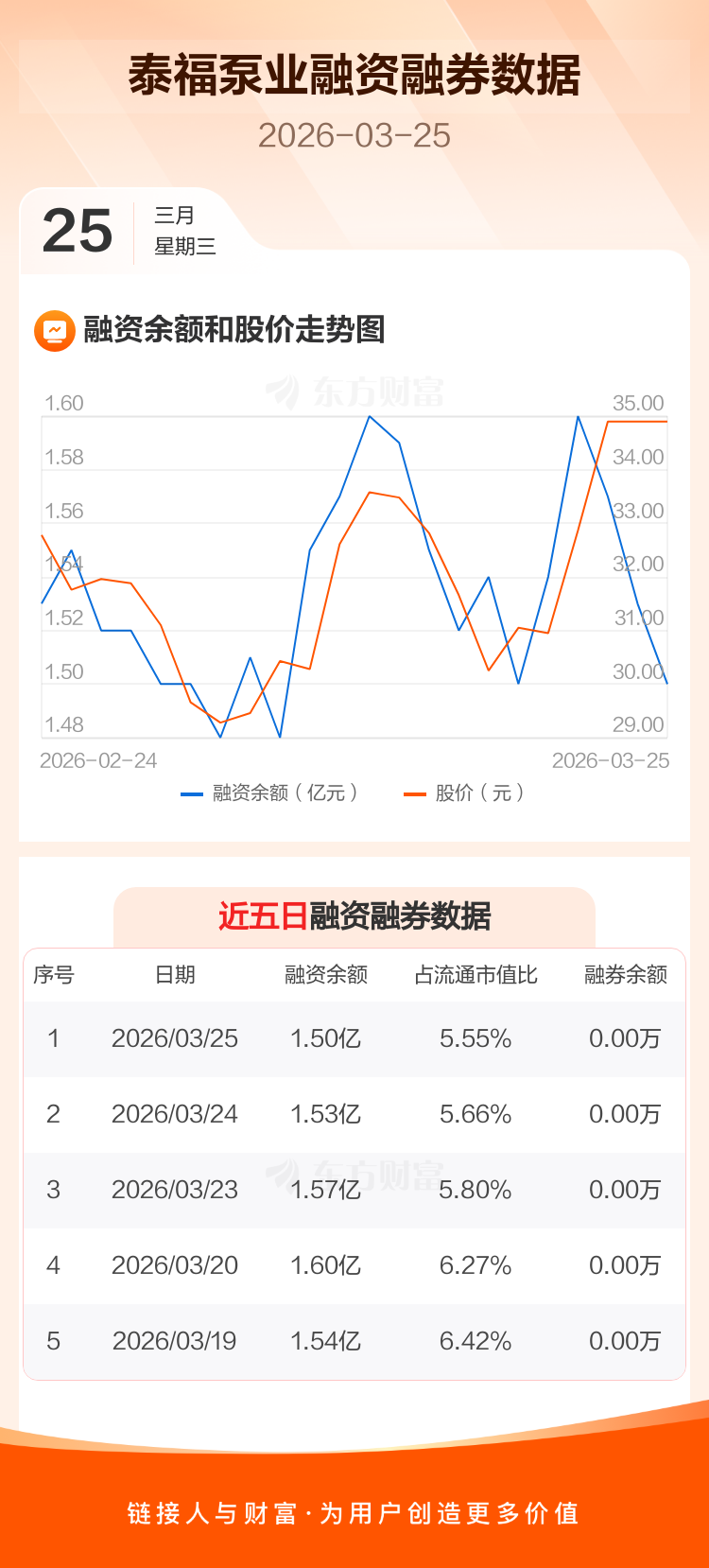 交易所最新数据显示,泰福泵业于2026年3月25日获融资买入0元,融资偿还302.71万元,当日融资净偿还302.71万元。目前,该股融资余额1.50亿,占流通市值比例为5.55%。