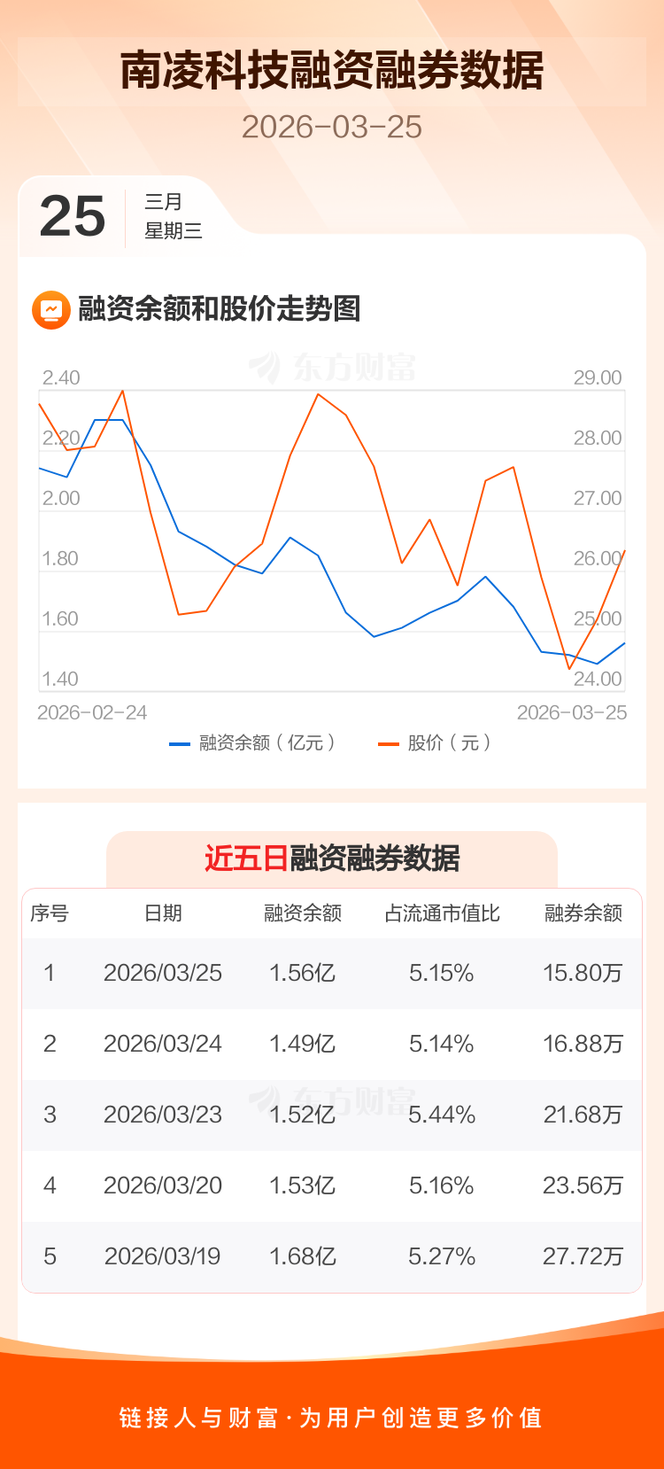 交易所最新数据显示,南凌科技于2026年3月25日获融资买入2738.94万元,融资偿还2034.85万元,当日融资净买入704.08万元。目前,该股融资余额1.56亿,占流通市值比例为5.15%。
