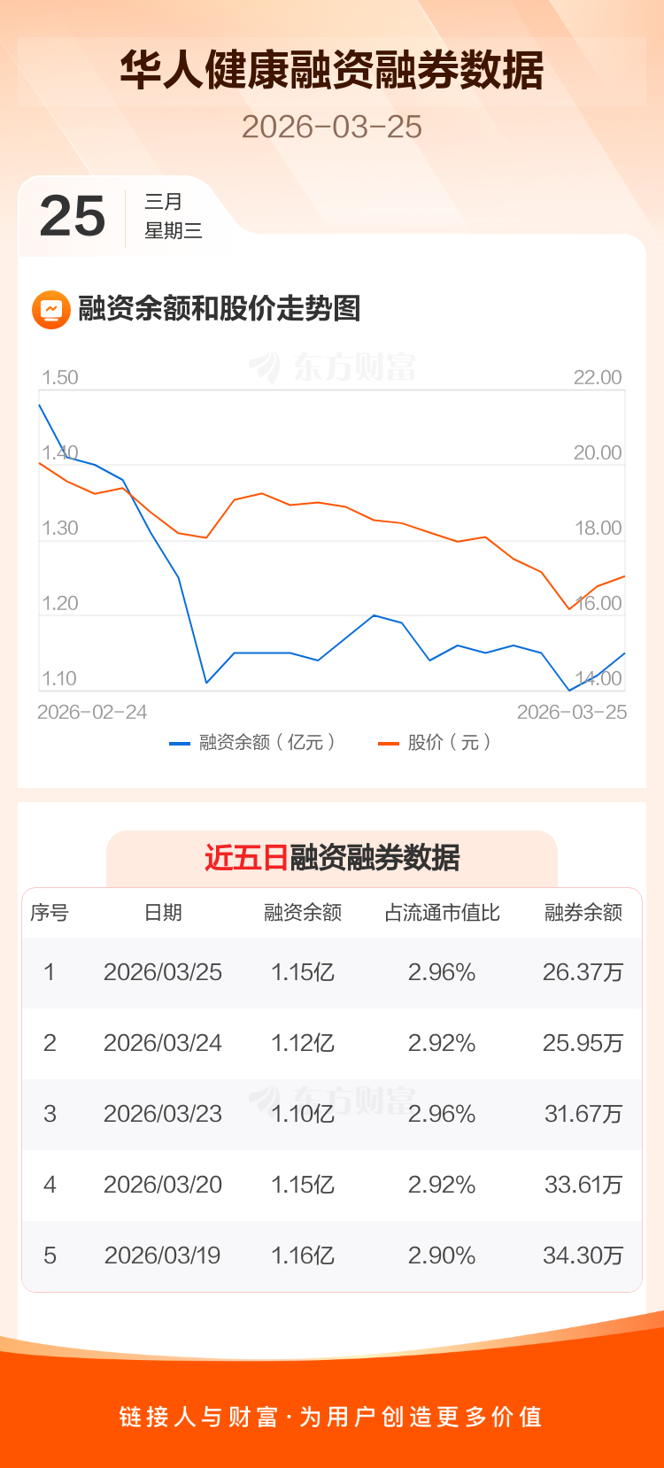 交易所最新数据显示,华人健康于2026年3月25日获融资买入1451.78万元,融资偿还1123.86万元,当日融资净买入327.93万元。目前,该股融资余额1.15亿,占流通市值比例为2.96%。