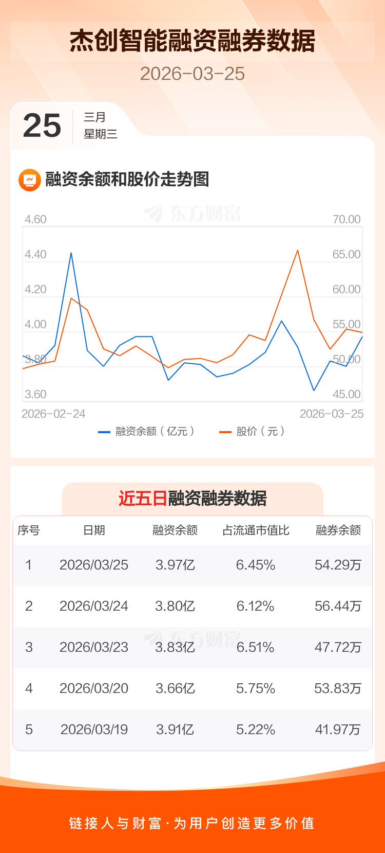 交易所最新数据显示,杰创智能于2026年3月25日获融资买入6117.63万元,融资偿还4404.96万元,当日融资净买入1712.66万元。目前,该股融资余额3.97亿,占流通市值比例为6.45%。
