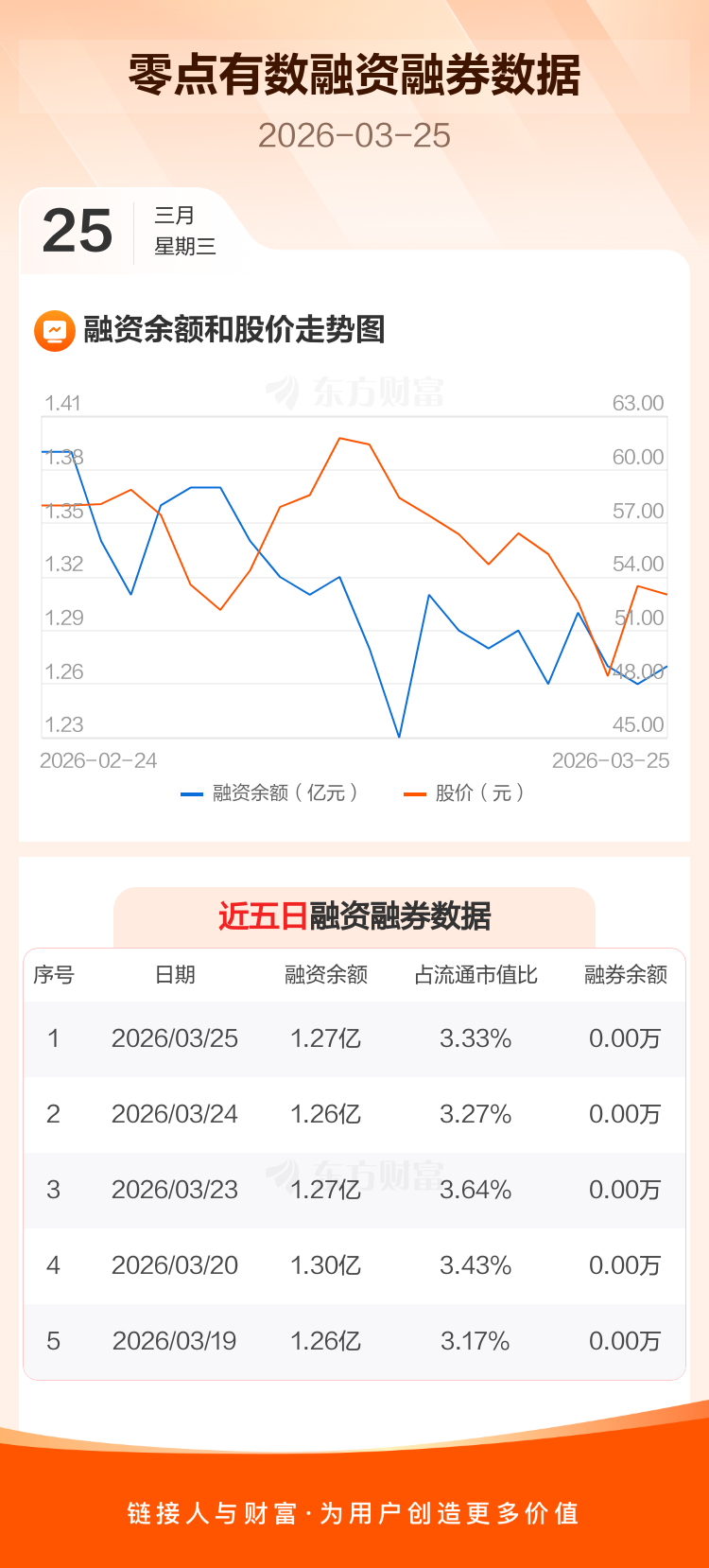 交易所最新数据显示,零点有数于2026年3月25日获融资买入951.33万元,融资偿还842.53万元,当日融资净买入108.8万元。目前,该股融资余额1.27亿,占流通市值比例为3.33%。