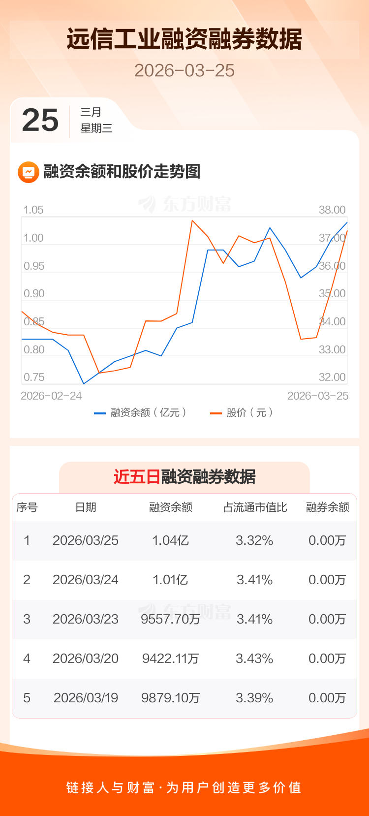交易所最新数据显示,远信工业于2026年3月25日获融资买入1749.55万元,融资偿还1462.66万元,当日融资净买入286.9万元。目前,该股融资余额1.04亿,占流通市值比例为3.32%。