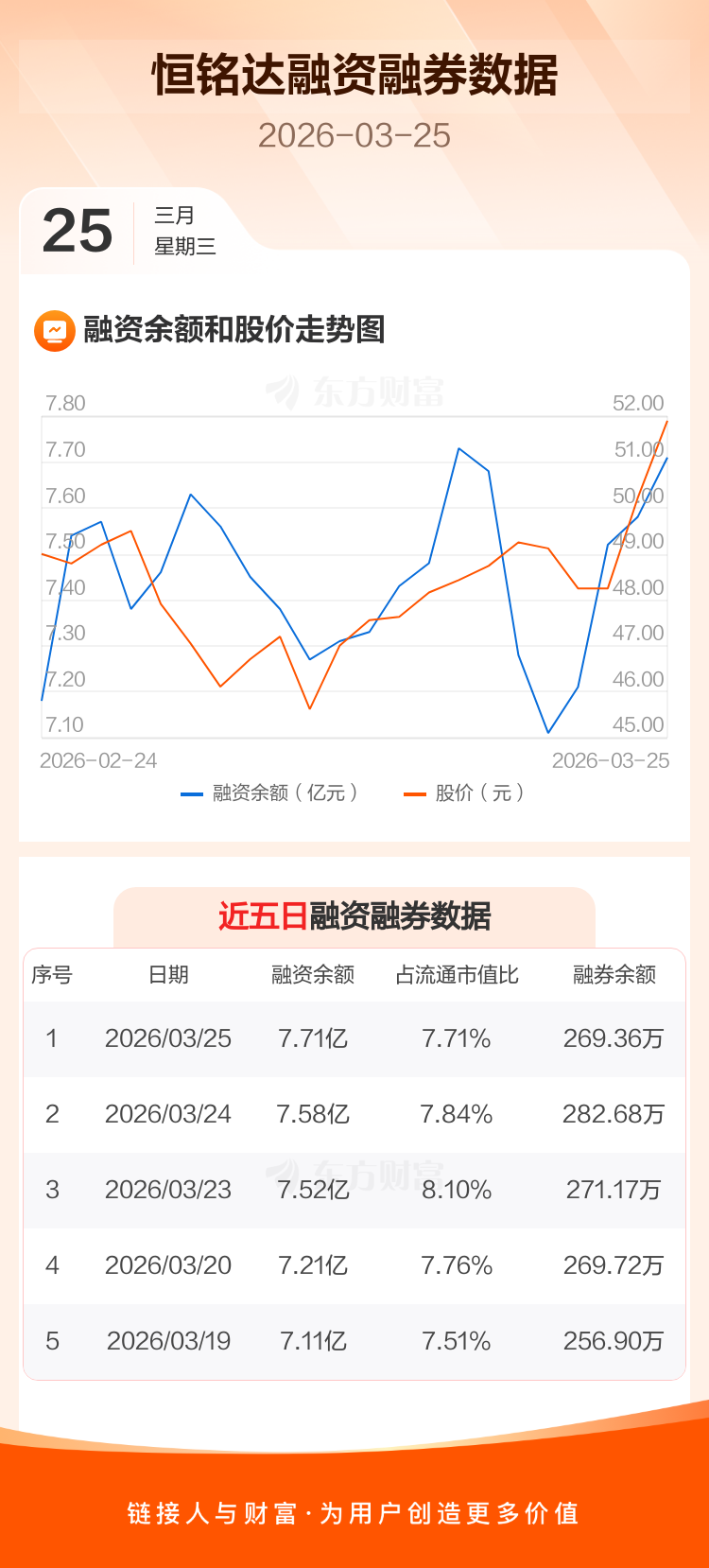 交易所最新数据显示,恒铭达于2026年3月25日获融资买入7654.63万元,融资偿还6418.57万元,当日融资净买入1236.07万元。目前,该股融资余额7.71亿,占流通市值比例为7.71%。
