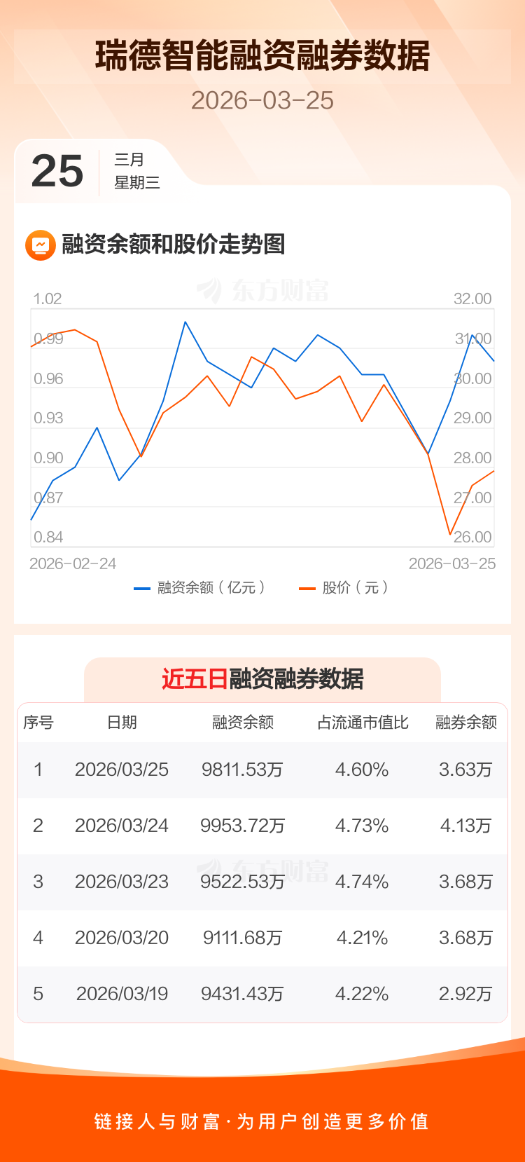 交易所最新数据显示,瑞德智能于2026年3月25日获融资买入339.00万元,融资偿还481.19万元,当日融资净偿还142.19万元。目前,该股融资余额9811.53万,占流通市值比例为4.60%。