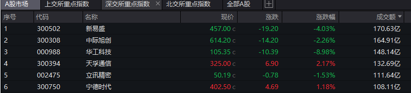 沪深两市成交额跌破2万亿元,较上一个交易日缩量2362亿元。个股方面,新易盛全天成交额超170亿元居首,中际旭创、华工科技、天孚通信、立讯精密等个股成交额均在110亿元以上。
