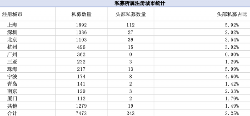 头部私募(管理规模50亿元以上)的分布更为集中。数据显示,全国243家头部私募中,193家集中在北上广深杭,占比接近80%。其中,上海一城就拥有112家头部私募,占全国总量的46%以上,头部私募占比达5.92%,远高于深圳的2.02%和北京的3.54%。杭州以15家头部私募、3.02%的占比位居第四,而广州虽然拥有362家私募,但头部私募数量为0。