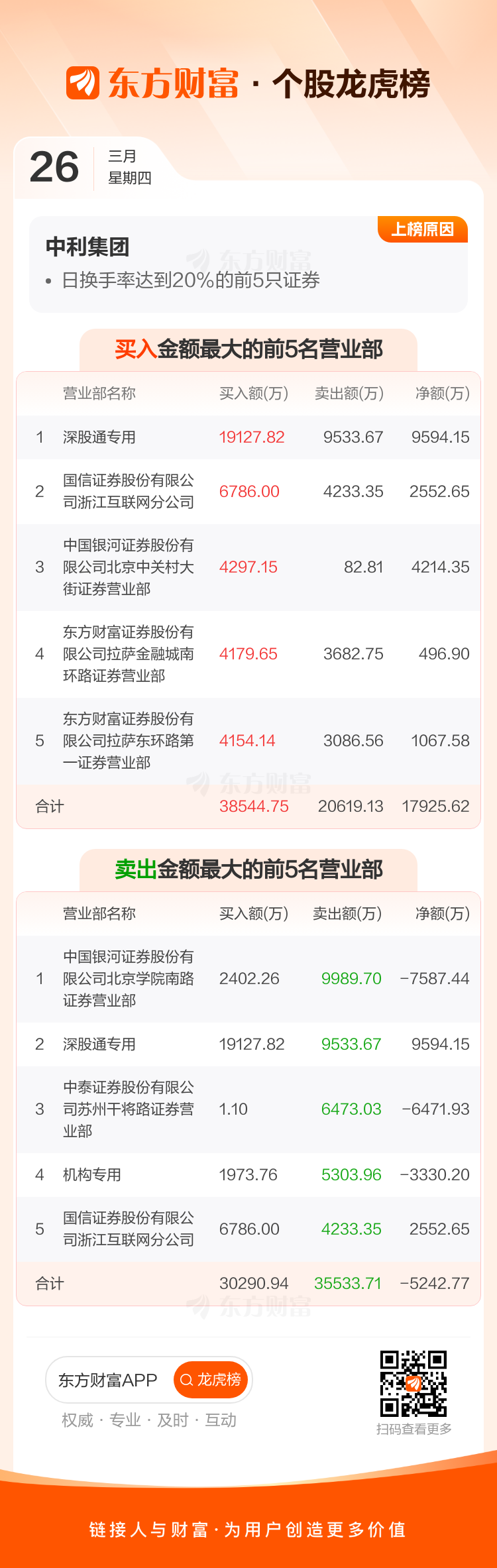 交易所2026年3月26日公布的交易公开信息显示,中利集团因成为日换手率达到20%的前5只证券上榜。中利集团当日收报4.74元,涨跌幅-6.51%,偏离值37.39%,换手率37.39%,成交额44.52亿。