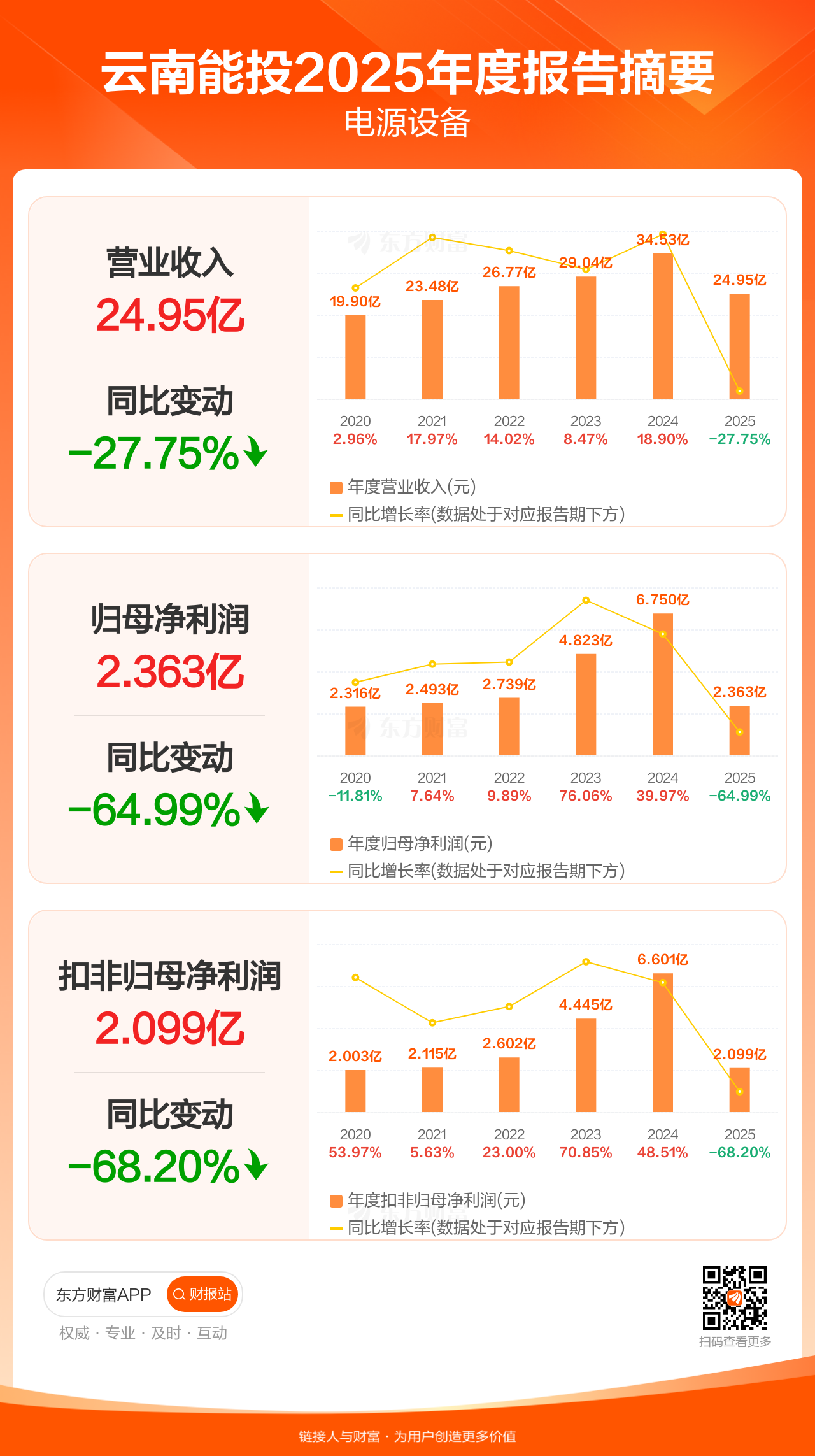 云南能投3月27日发布2025年年报显示,公司全年实现营业收入24.95亿元,同比下滑27.75%;归母净利润2.36亿元,同比下滑64.99%;扣非归母净利润2.10亿元,同比下滑68.20%。