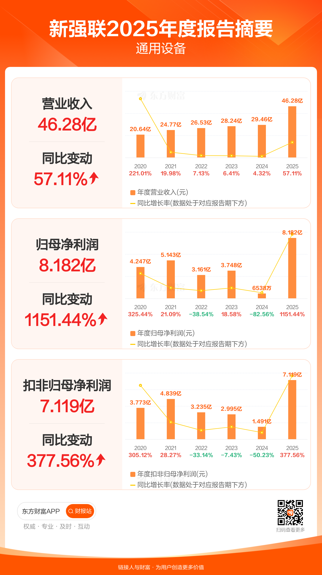 新强联3月27日发布2025年年报显示,公司全年实现营业收入46.28亿元,同比增长57.11%;归母净利润8.18亿元,同比增长1151.44%;扣非归母净利润7.12亿元,同比增长377.56%。