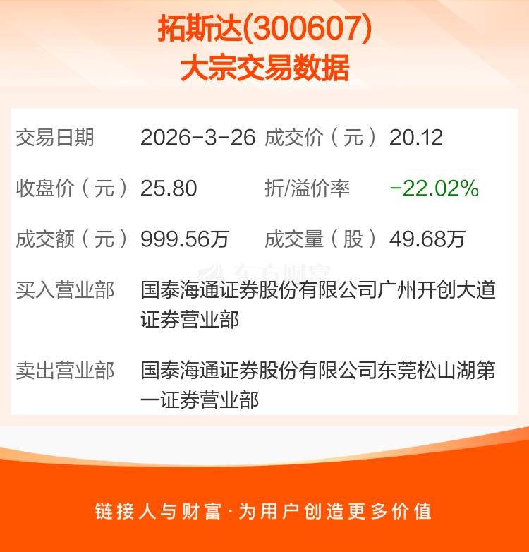 大宗交易:拓斯达成交999.56万元,折价22.02%(3-26)