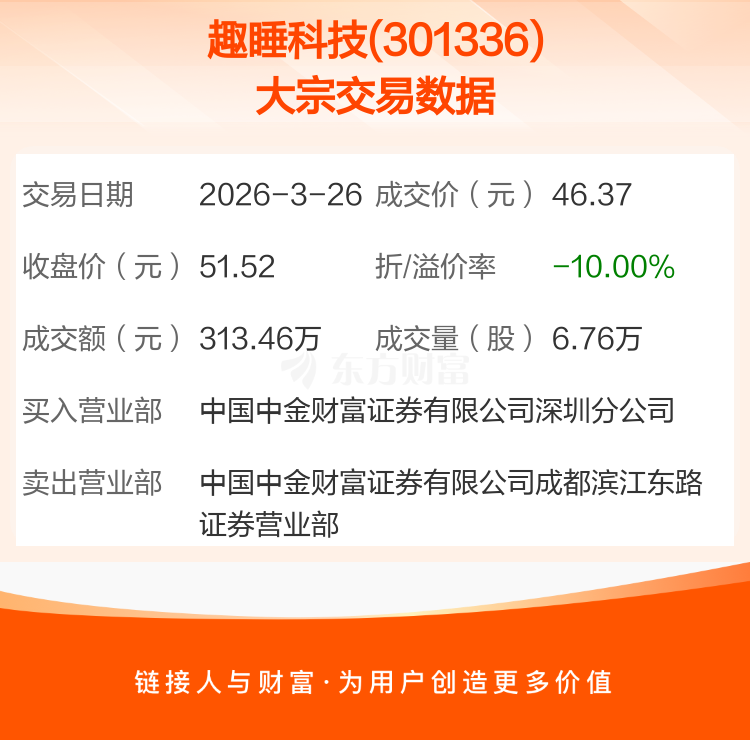 2026年3月26日,趣睡科技发生1笔大宗交易,共成交6.76万股,成交金额313.46万元,占其流通市值比例为0.20%。