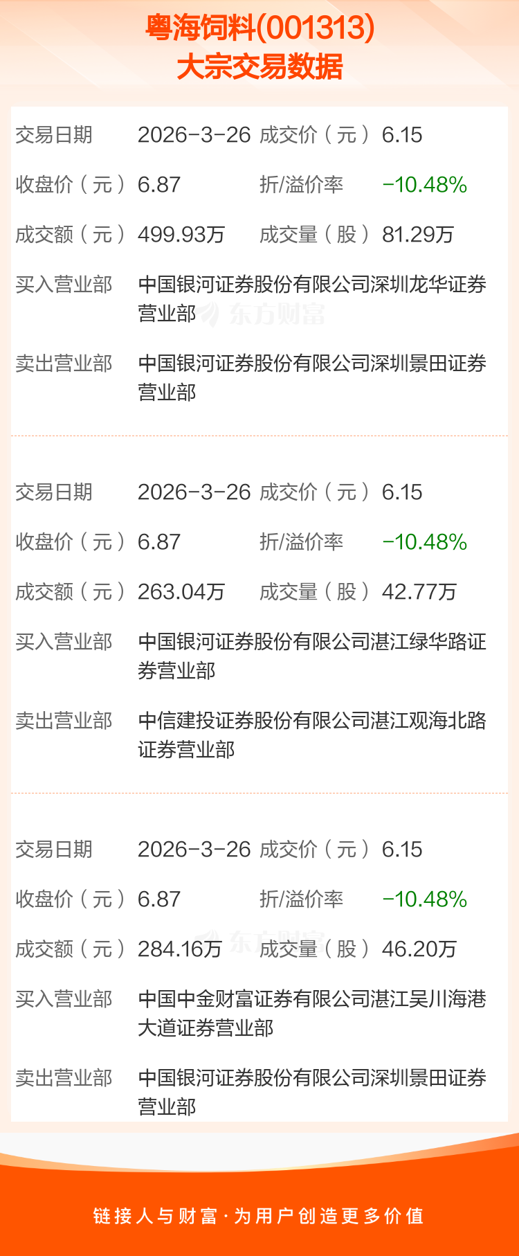 2026年3月26日,粤海饲料发生3笔大宗交易,共成交170.26万股,成交金额1047.13万元,占其流通市值比例为0.22%。