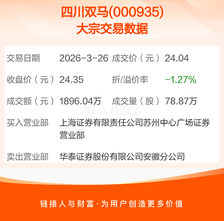 2026年3月26日,四川双马发生1笔大宗交易,共成交78.87万股,成交金额1896.04万元,占其流通市值比例为0.10%。