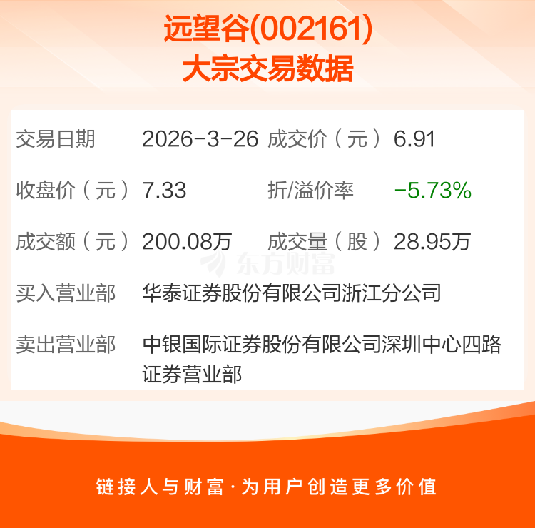 2026年3月26日,远望谷发生1笔大宗交易,共成交28.95万股,成交金额200.08万元,占其流通市值比例为0.04%。