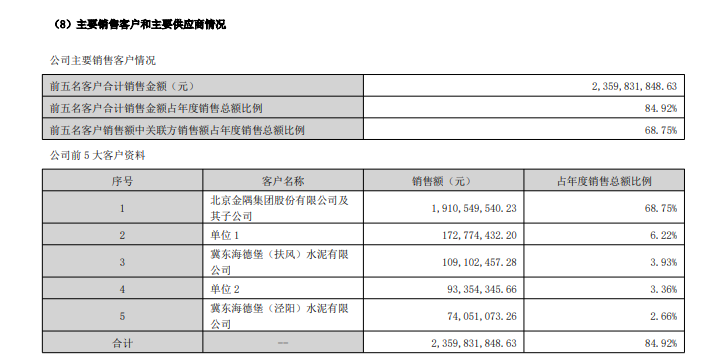 年报中披露的前五大客户资料显示,北京金隅集团股份有限公司及其子公司为公司第一大客户,占年度销售总额比例达到68.75%;冀东海德堡(扶风)水泥有限公司为公司第三大客户,占年度销售总额比例为3.93%;冀东海德堡(泾阳)水泥有限公司为公司第五大客户,占年度销售总额比例为2.66%。