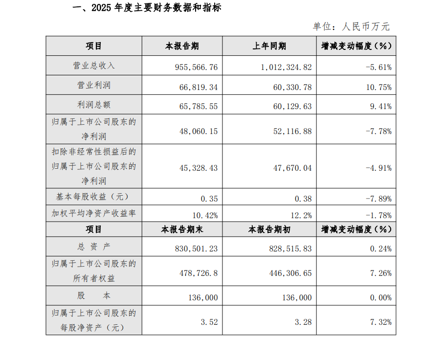 从财务数据来看,2025年公司营业总收入95.56亿元,较上年同期的101.23亿元减少约5.67亿元;利润总额6.58亿元,同比增长9.41%;营业利润6.68亿元,同比增长10.75%。