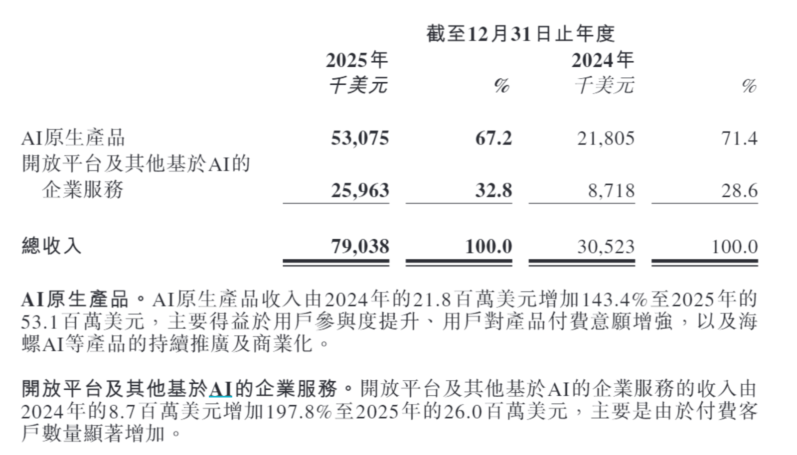 在2025年年报中,MiniMax则提到,2025年AI原生产品收入为5307.5万美元,同比增加143.4%,主要得益于用户参与度提升、用户对产品付费意愿增强,以及海螺AI等产品的持续推广及商业化。
