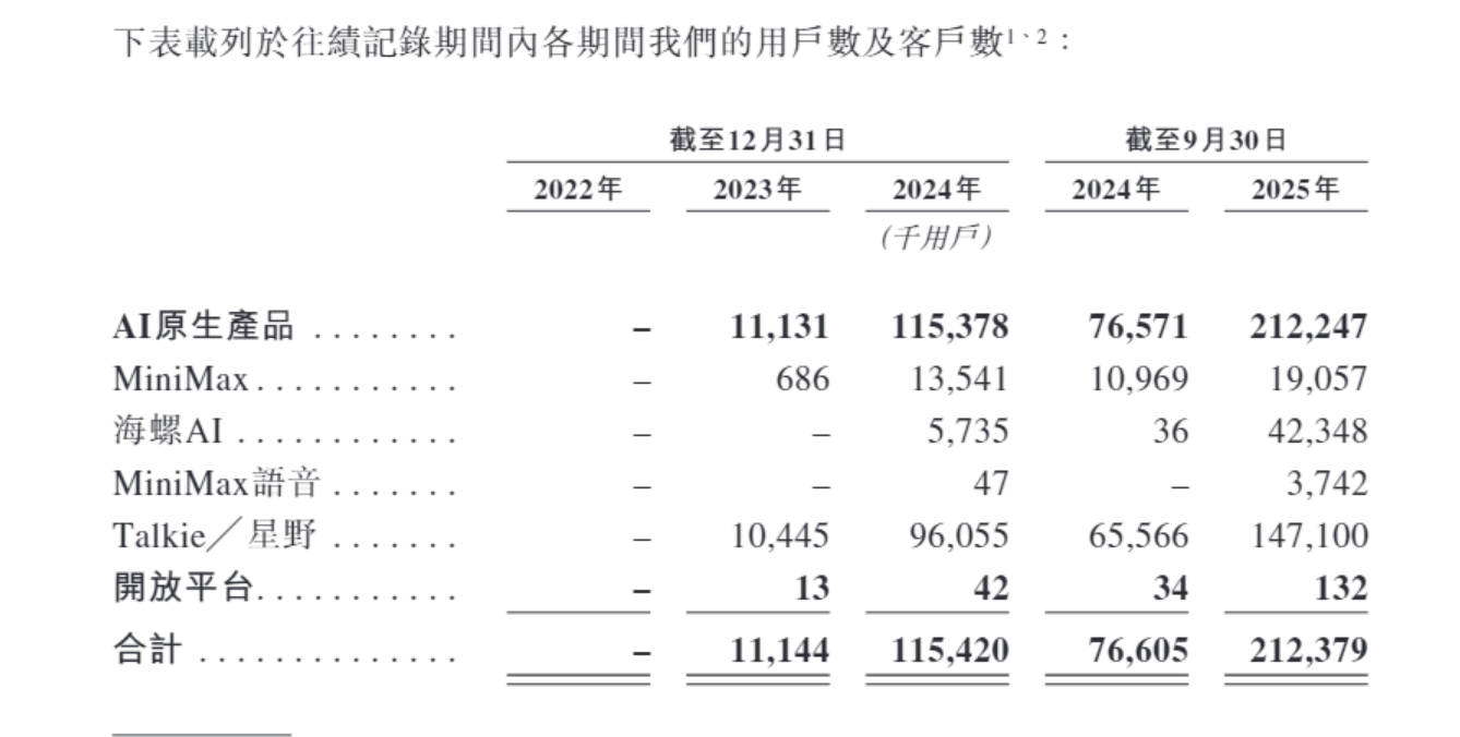 另外MiniMax(00100.HK)的招股书显示,截至2024年第四季度末,海螺AI的用户数及客户数为573.5万,截至2025年第三季度末,海螺AI的用户数及客户数为4234.8万。