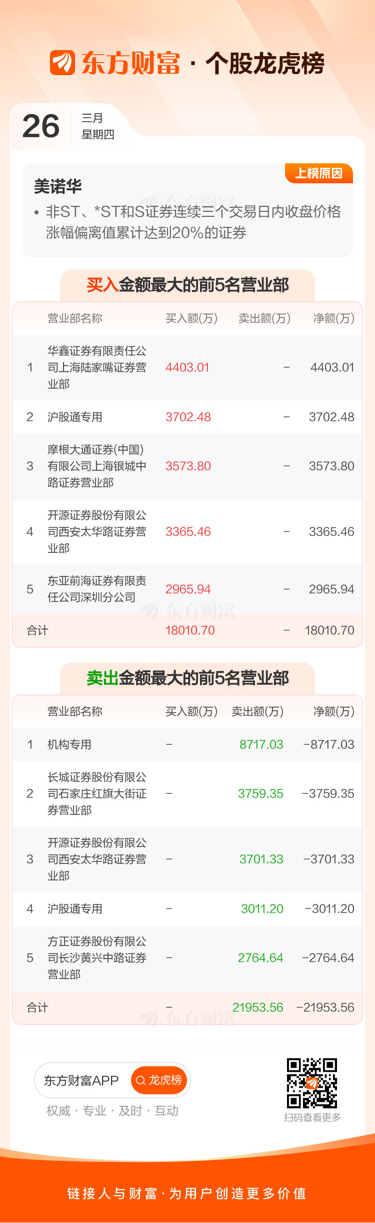交易所2026年3月26日公布的交易公开信息显示,美诺华因成为非ST、*ST和S证券连续三个交易日内收盘价格涨幅偏离值累计达到20%的证券上榜。美诺华当日收报35.62元,涨跌幅10.01%,换手率13.31%,成交额10.14亿。异常期间3月25日至3月26日,期间涨幅20.99%,累计偏离值20.79%,区间成交额19.53亿。