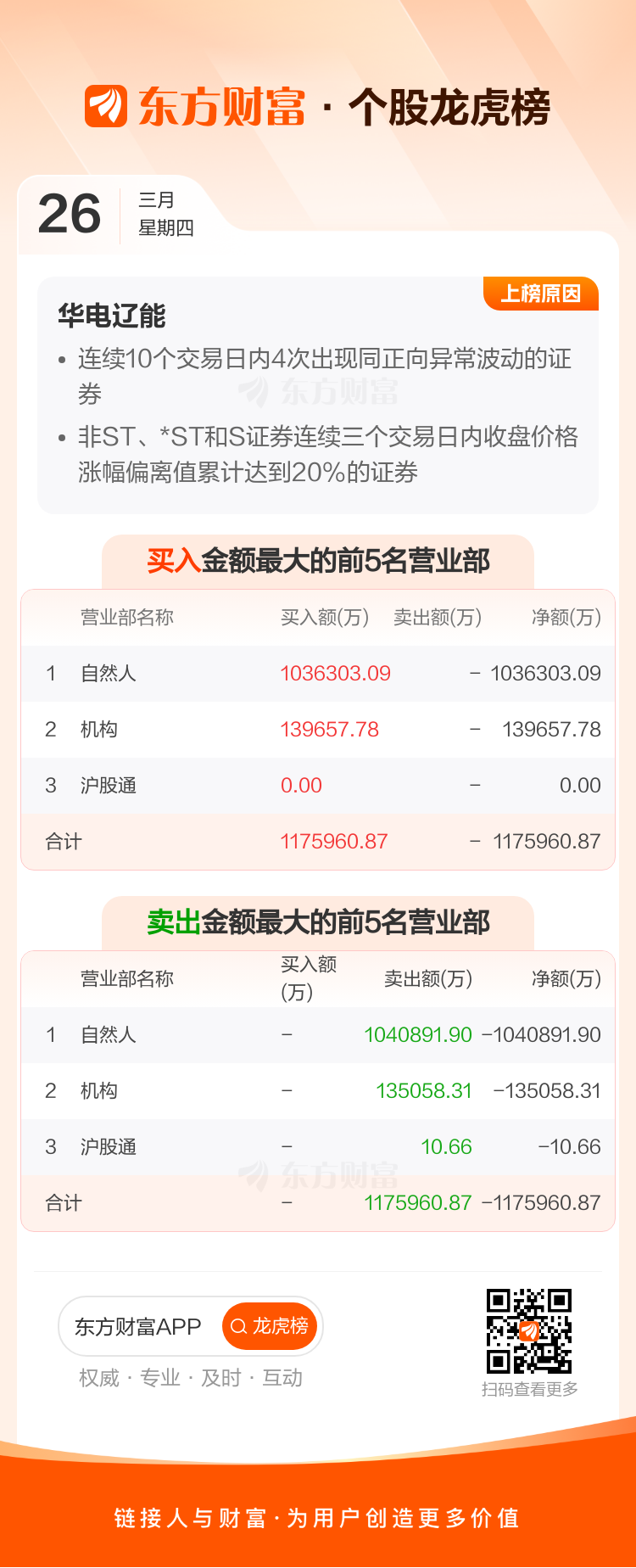 交易所2026年3月26日公布的交易公开信息显示,华电辽能因成为连续10个交易日内4次出现同正向异常波动的证券、非ST、*ST和S证券连续三个交易日内收盘价格涨幅偏离值累计达到20%的证券上榜。华电辽能当日收报8.88元,涨跌幅6.47%,换手率23.43%,成交额30.90亿。异常期间3月16日至3月26日,期间涨幅128.87%,累计偏离值97.20%,区间成交额117.60亿。异常期间3月24日至3月26日,期间涨幅28.88%,累计偏离值26.89%,区间成交额56.57亿。