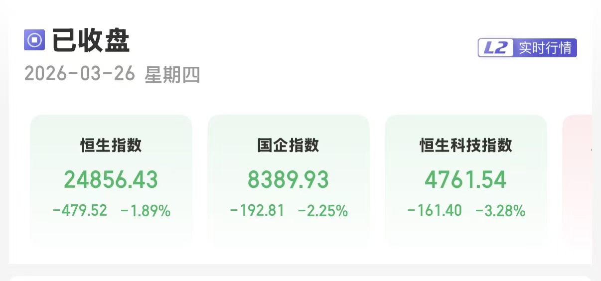 3月26日,港股三大指数下挫。截至收盘,恒生指数跌1.89%,报24856.43点;恒生国企指数跌2.25%,报8389.93点;恒生科技指数跌3.28%,报4761.54点。