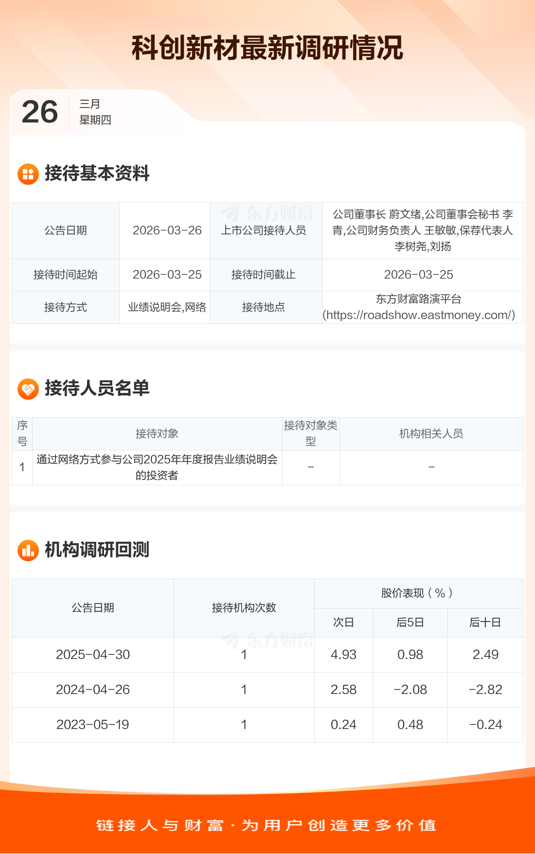 科创新材3月26日公告称,3月25日接待通过网络方式参与公司2025年年度报告业绩说明会的投资者等1家机构调研。接待人员包括公司董事长 蔚文绪,公司董事会秘书 李青,公司财务负责人 王敏敏,保荐代表人 李树尧,刘扬。