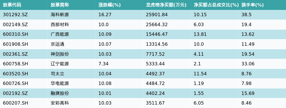 南财智讯3月26日电,盘后数据显示,因当日异动登上龙虎榜的个股中,资金净买入最多的前三位分别是海科新源(301292.SZ)、西部材料(002149.SZ)与广西能源(600310.SH)。其中排名第一的海科新源净买额达2.59亿元,占总成交金额的10.15%。海科新源当日收盘上涨16.27%,换手率为38.5%,净买入额前10个股详情见下图: