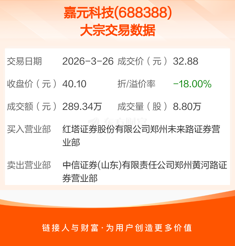 大宗交易:嘉元科技成交289.34万元,折价18.00%(3-26)
