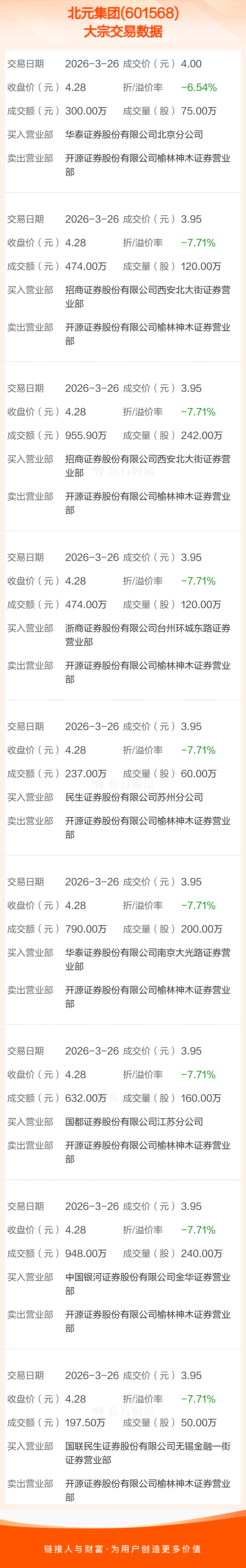 2026年3月26日,北元集团发生9笔大宗交易,共成交1267.00万股,成交金额5008.40万元,占其流通市值比例为0.29%。