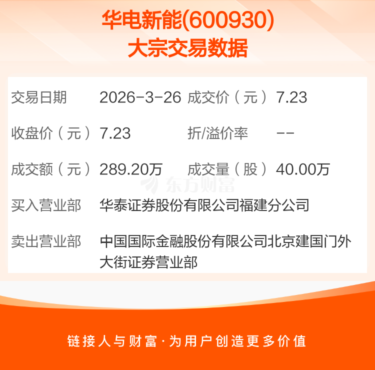 2026年3月26日,华电新能发生1笔大宗交易,共成交40.00万股,成交金额289.20万元,占其流通市值比例为0.01%。