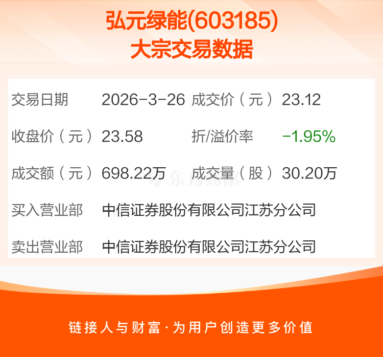 2026年3月26日,弘元绿能发生1笔大宗交易,共成交30.20万股,成交金额698.22万元,占其流通市值比例为0.04%。