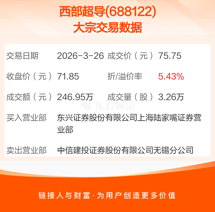 大宗交易:西部超导成交246.95万元,溢价5.43%(3-26)